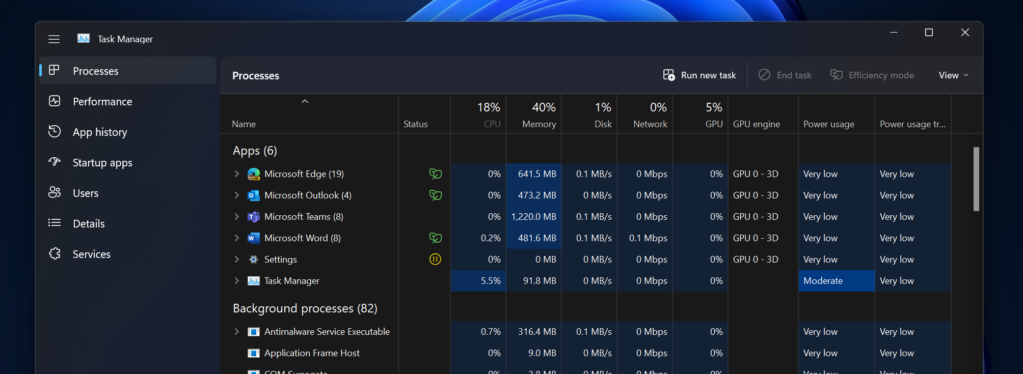 - 使用工作管理員的命令列啟用效率模式可能會導致處理程序頁面上的程序清單在應用程式與背景處理程序之間跳動的問題,暫時替代方案為使用右鍵選單來調控效率模式並重新開啟工作管理員。
