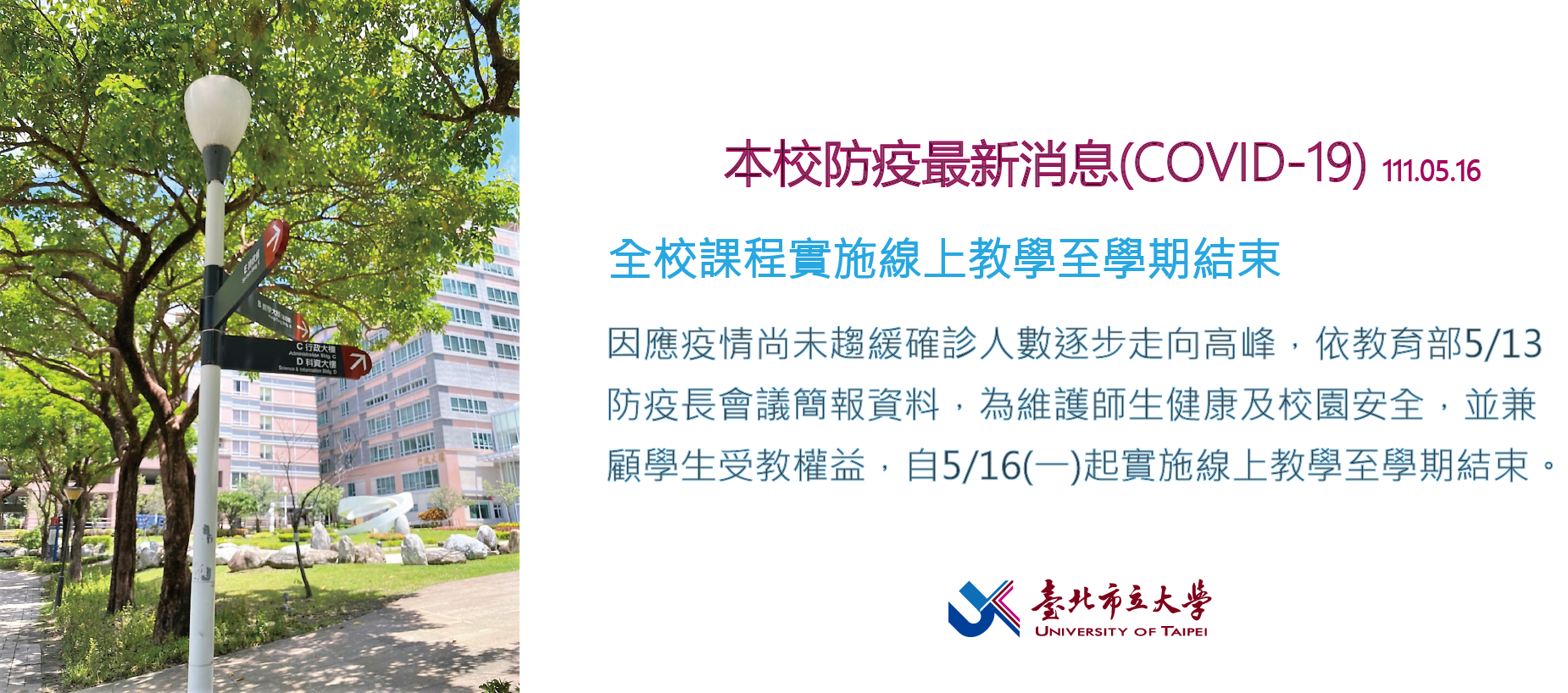 | 國立臺北大學 (099) | 2022-05-18 | 自即日起實施全校性遠距教學措施至期末。 |